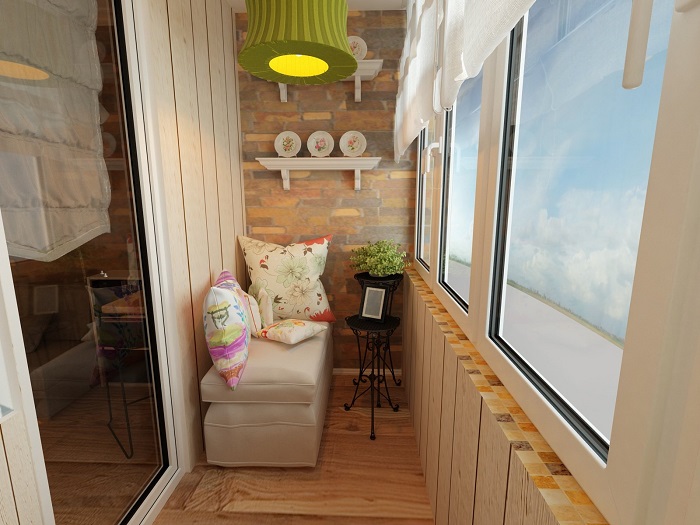 Теперь немного о нюансах. Если вы планируете сделать из балкона зону отдыха, обязательно позаботьтесь о наличии светильников с мягким теплым светом, не раздражающим глаза. Обычно дизайнеры отдают предпочтение точечному освещению, но можно также повесить компактную люстру, настенные светильники, поставить торшер рядом с креслом или лампу на стол. Следующие важные моменты: розетки для подключения зарядных устройств, комфортный температурный режим (стеклопакеты следует заменить на энергосберегающие, чтобы даже зимой здесь было уютно находиться).