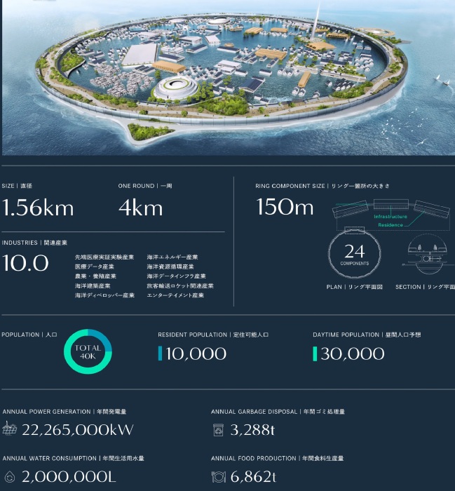 Что касается продуктов питания, играющих главенствующую роль в поддержании здоровья человека, функциональные ингредиенты и сельскохозяйственные культуры будут выращиваться на месте с использованием инновационной технологии культивирования, основанной на грамотной переработке морской воды и подводных растений, которые станут идеальным источником питательных веществ. Проектом предусмотрены производство около 7 тыс. тонн разнообразных продуктов питания в год, а также генерация свыше 22 миллионов кВт электроэнергии. «Я подумал, что было бы здорово, если бы мы могли создать город, где у людей появилась бы возможность естественным образом улучшить свое здоровье, живя в среде, которая с самого начала была спроектирована так, чтобы максимально эффективно способствовать профилактики заболеваний», — поделился своими мыслями профессор Высшей школы медицины и инженерии Токийского университета Юичи Тей, один из главных специалистов консультативного совета Консорциума «Новый океан», который сможет реализовать проект плавучего города будущего.
