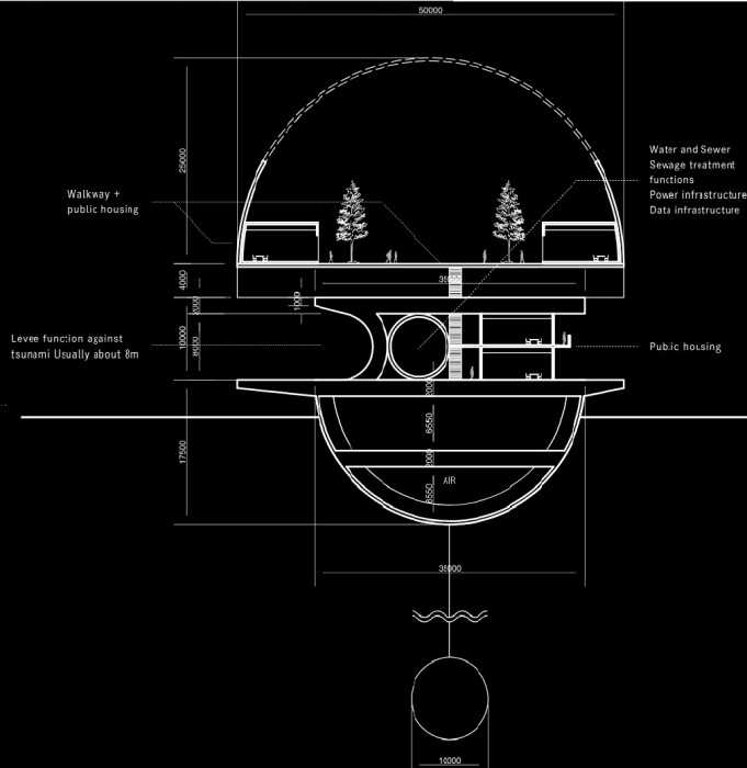 Концептом предусмотрен не просто самодостаточный морской город с организацией инфраструктуры на плавучих платформах, подводная часть объекта будет задействована, в научно-исследовательских целях, для обустройства экспериментальных лабораторий, для размещения центра обработки данных, систем охлаждения и очистки, рыбных ферм, особо экзотических развлекательных зон и жилых пространств. При этом планируется сделать еще один шаг к безопасному потреблению энергии, экологической безопасности, основанной на нулевом выбросе углерода промышленных предприятий, транспортных систем (сугубо экологически чистые плавучие средства) и всех архитектурных/инфраструктурных объектов.