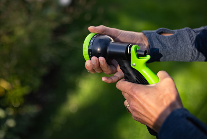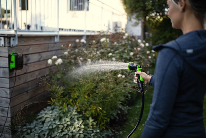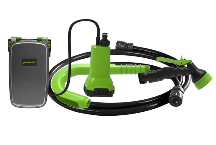Питает насос литий-ионный аккумулятор Greenworks 24 В, который также используется во всех устройствах линейки 24 В. Отсек с батареей насоса отлично защищен от любых попаданий влаги, что подтверждает класс защиты IPX4. 50 минут автономной работы от аккумулятора емкостью 4 А*ч вполне достаточно для качественного полива среднеразмерного участка. В комплекте с насосом поставляется шланг длиной 2 метра с распылителем пистолетного типа, работающим на восьми разных режимов полива: от тонкой струи до влажного тумана для бережного орошения даже самых нежных цветов и растений.