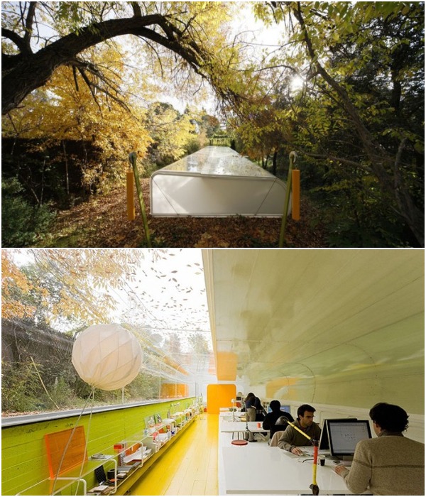 Офис в лесу — это, казалось бы, несбыточная мечта людей, которые уже устали от того, что приходится работать в душном и переполненном центре города. Эти фантазии удалось реализовать руководителям креативной компании Selgas Cano, специализирующейся на проектировании зданий мирового уровня. Теперь главный испанский офис Selgas Cano в Мадриде представляет собой удивительное архитектурное пространство, мастерски объединяющее работу и природу. Здание офиса находится в первозданном лесном массиве, что позволяет обеспечить сотрудников возможностью всецело наслаждаться освежающими природными пейзажами. Кстати сказать, авторами проекта является сам коллектив компании, которые решили «растворить» стены, сделав их абсолютно прозрачными.