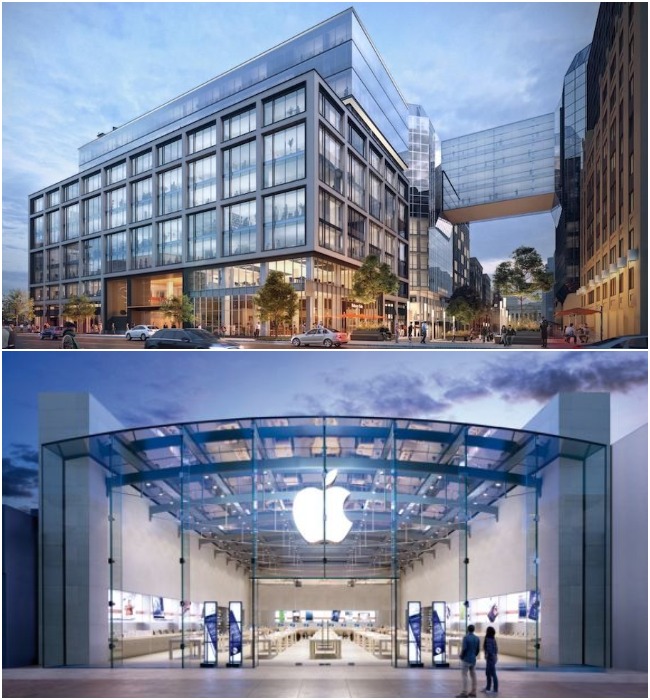 В оформлении офисов и магазинов Apple преобладают масштаб, футуристичность форм и узнаваемая символика.