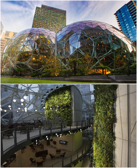 Впечатляющий купольный комплекс в деловом районе Сиэтла с первого дня его строительства вызывал повышенный интерес. И неспроста! Здания-сферы, внутри которых вперемешку с рабочими пространствами, переговорными, зонами отдыха и общения размещаются зимние сады и оранжереи, привлекают к себе внимание прохожих. Офисные структуры растворятся под роскошной кроной деревьев и теряются в лабиринтах парковых зон (насчитывается около 40 тыс. растений), которым найдется место под прозрачными куполами зданий. Авторы Novate.ru хотели бы отметить, что некоторые пространства открыты для посещений публики, по офису можно не только прогуляться, но и отправиться на 90-минутную познавательную экскурсию (проходят по средам), только записаться нужно заранее.