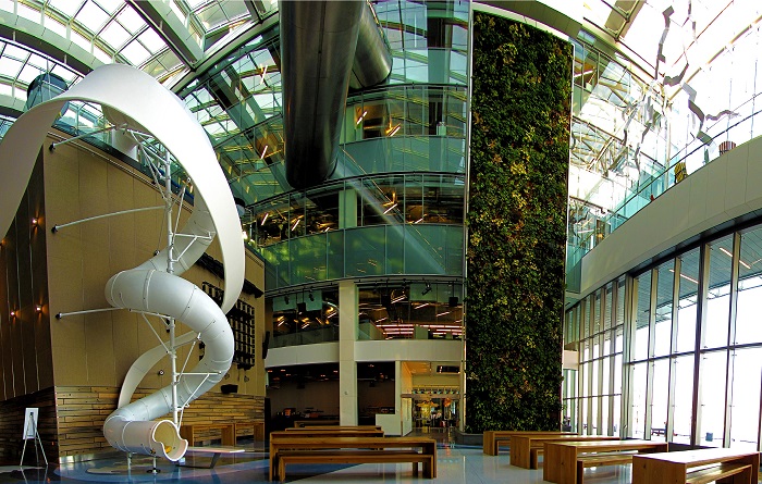 Примечательно: Оригинальное здание офиса может похвастаться: пятиэтажным атриумом, трехэтажной горкой-трубой, гостиной над двумя телевизионными студиями, офисными пространствами, дающими своим сотрудникам (в настоящее время более 1,1 тыс. человек) лучшую версию рабочего места, которую можно себе представить. А также оригинальные пространства для общения и сотрудничества, обеденные зоны и зоны отдыха.