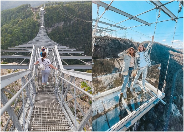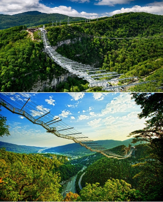 Сочинский небесный мост – волнующий аттракцион, способный выдержать любой ураган и 9-бальное землетрясение (Skypark, Россия). Натянутый над лесистым Ахштырским ущельем и рекой Мзымта недалеко от Сочи, Сочинский небесный мост (Скайбридж) является самым длинным пешеходным подвесным мостом в России (длина 439 м, расположен на высоте 200 от дна ущелья). Вместо привычной ровной дорожки этот мост сделан из соединенных сегментов ступеней, что придает ему уникальный геометрический вид. Плюс ко всему для тех, кто не мыслит жизнь без адреналина предусмотрены стеклянные балкончики, так что захватывающие дух ощущения точно обеспечены. Ну а с высоты самого моста, посетители могут увидеть Колхидский лес, горы Кавказа побережье Черного моря, сделать будоражащие воображение фотографии, паря словно в невесомости на стеклянных балкончиках.