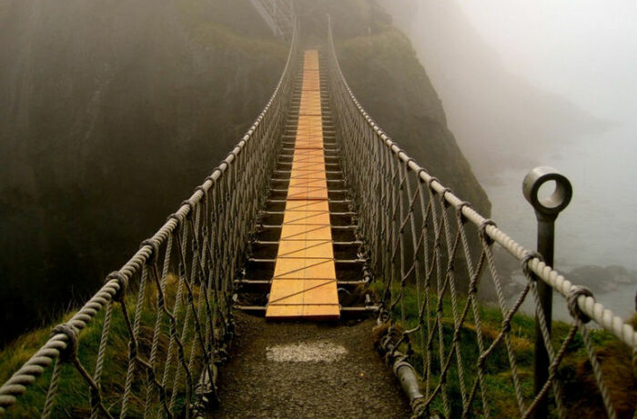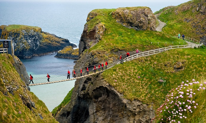 Созданный в 1755 году местными рыбаками для того, чтобы добраться до лучших рыбных мест во время сезонного хода лосося, веревочный мост соединяющий небольшой остров Каррик-а-Реде (отсюда и название) с материковой частью Северной Ирландии, сейчас является крутой туристической достопримечательностью. Покачиваясь на 30-метровой высоте над скалистой береговой линией, мост длиной 30 метров, хоть и обновлялся много раз за эти годы, но все так же остался канатным, поэтому по достоинству оценивается любителями острых ощущений. Поскольку лосось больше не мигрирует в эти места, да и промысел иссяк, мост Carrick-a-Rede превратился в популярное туристическое место, причем не столько из-за его исторического значения, путешествующих веревочный мост привлекает открывающимися видами на ирландское побережье и близлежащие острова (в ясные дни можно увидеть даже Шотландию), да и проверить себя на стойкость духа многие тоже не прочь.