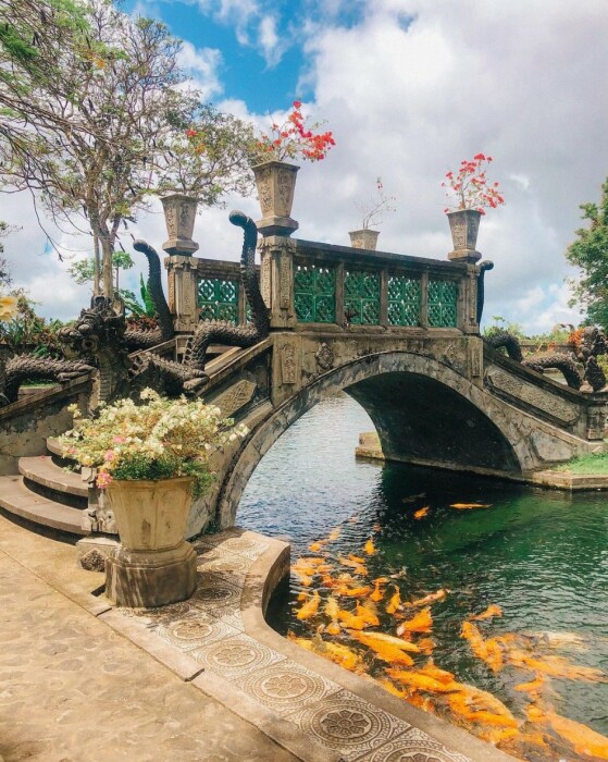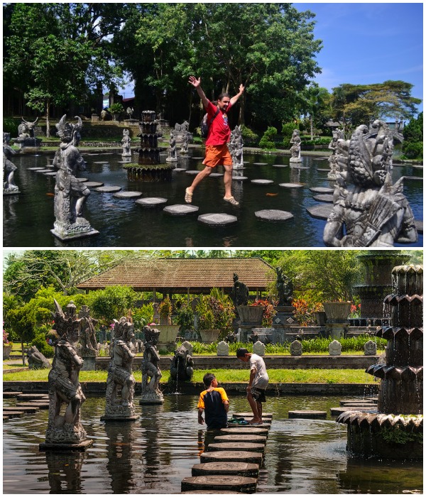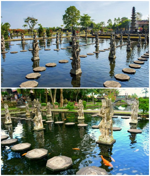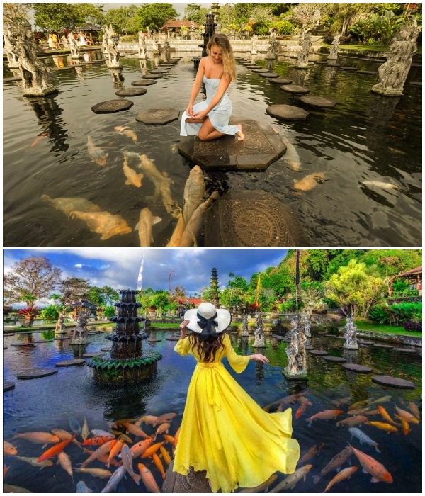 Самым популярным объектом водного дворца (который стал еще более привлекательным благодаря тем самым фотографиям в социальных сетях) являются балийские ступеньки. Если смотреть издалека, то может показаться, что гости «парят» над водой, но это не так. Эффект парения достигается за счет установленных платформ/плит восьмигранной формы с вырезанными индуистскими символами, которые едва возвышаются над водой. Платформы, расположенные на небольшом расстоянии друг от друга, идут вокруг 11-ярусного фонтана, который окружают извергающие воду скульптуры божеств, демонов и мифологических существ, что делает его идеальным местом для лучших фотографий, достойных Instagram и др. соцсетей. Но и это еще не все. В этом же пруду водятся желтые карпы кои – вечно голодные создания, которых грех не покорить, тем более что этот процесс доставляет огромное удовольствие как детям, так и взрослым.