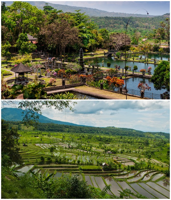Трехуровневый водный ансамбль подпитывает рисовые поля, расположенные вокруг него (Tirta Gangga Water Palace, Бали).