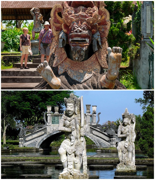 Территорию парковой зоны «охраняют» каменные и мраморные изваяния демонов, божеств и мифических существ (Tirta Gangga Water Palace, Бали).