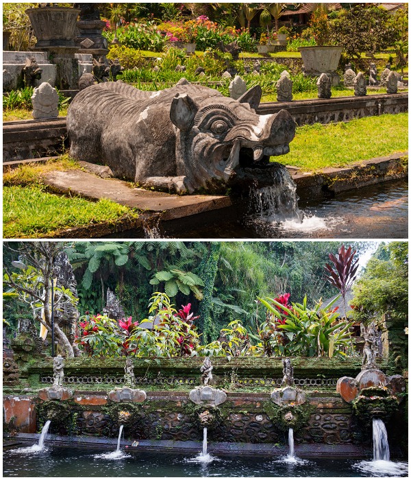 Скульптуры демонов ракшасы, способных принимать разные обличья, извергают водные потоки, которые они призваны защищать (Tirta Gangga Water Palace, Бали).