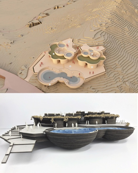 Так будут располагаться объекты развлекательного центра с рестораном и «грязевыми» бассейнами, которые станут единым целым с окружающим ландшафтом (макет Ummara Resort).