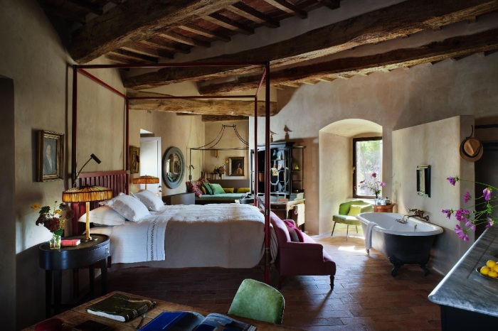В некоторых апартаментах установлены ванны на ножках прямо в спальных комнатах (Castello Di Reschio Hotel, Италия). | Фото: townandcountrymag.com.