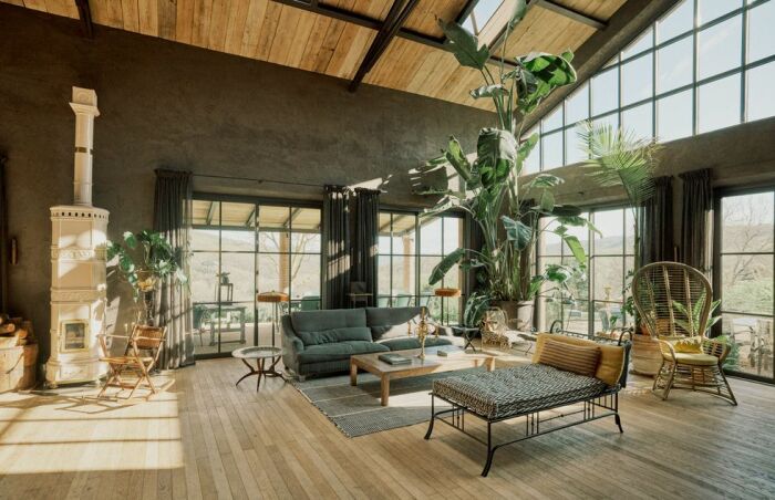 Чтобы не нарушать пасторальную идиллию местности новоделом, они решили объединить старую прачечную и башню для сушки табака, имеющую высокую сосновую крышу со стальным каркасом, в один объект. Получился такой себе амбар, соединенный стеклянным сооружением, в котором организовали зимний сад, поскольку Ненси очень любит живые растения. Именно он стал самым интересным местом, в обустройство которого аристократическое семейство вкладывало всю душу, чтобы создать собственный мир, не привязываясь к историческому прошлому поместья, хотя оно оказало главное влияние на выбор стиля интерьера и его наполнения.