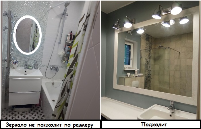Маленькое зеркало не только плохо справляется со своими функциями, но также выглядит гораздо хуже. Для ванной комнаты стоит подбирать более крупный экземпляр – он визуально смотрится дороже, зрительно расширяет пространство, делает комнату более светлой, что всегда актуально для маленького санузла.