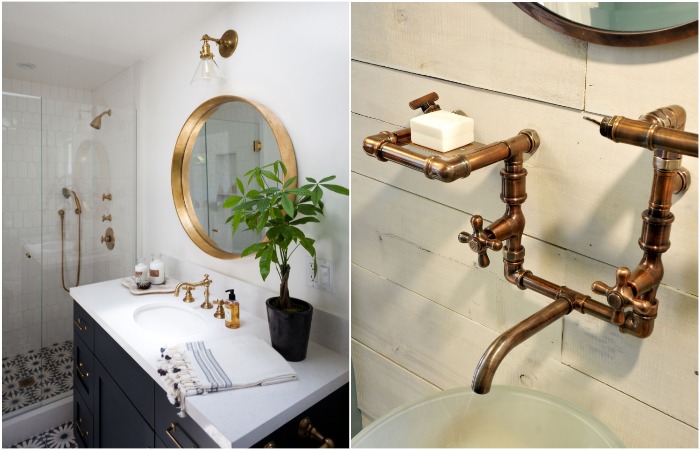 Еще один популярный способ, которым пользуются дизайнеры, чтобы придать интерьеру ванной комнаты глубины – детали в винтажном стиле. Это направление уже давно не выходит из моды, поэтому смело можете вписывать ретро-элементы в обстановку. Органично будут смотреться металлические смесители и массивная лейка для душа под золото. Также в качестве акцентов подойдут светильники и декор.