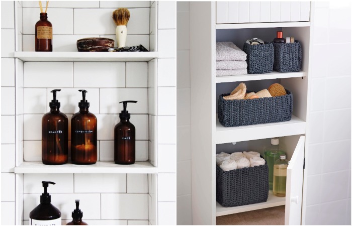 Пожалуй, самым простым и бюджетным способом, который позволяет сделать ванную комнату визуально дороже, является правильно организованное хранение. Присмотритесь к всевозможным органайзерам, плетеным корзинам, стильным бутылочкам для хранения гелей, бальзамов, шампуней. Последние стоит подбирать в цвет уже имеющихся элементов дизайна. Лучше выбирать емкости без надписей – в будущем можно будет распечатать и наклеить собственные этикетки, в зависимости от содержимого бутылки.