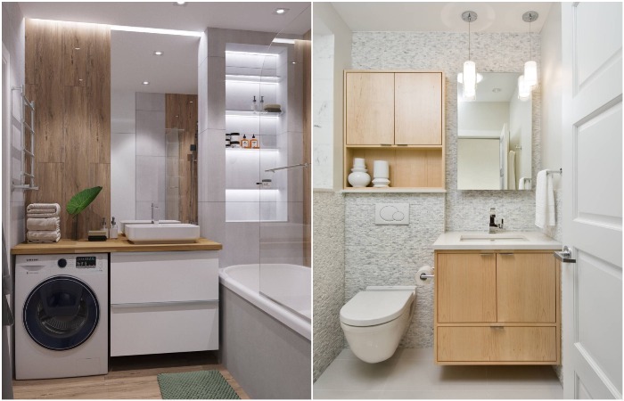 Подберите в магазине тумбу, которая крепится на стену, а затем установите на нее накладную раковину. Такой вариант всегда смотрится гораздо выигрышнее и интереснее, чем стандартная модель на ножках. Присмотритесь к изделию из дерева со специальной влагостойкой пропиткой – на фоне остальных элементов санузла он будет выгодно выделяться и создавать нужный контраст. Что касается столешницы, то идеально подойдет каменная – она сделает обстановку еще более особенной и роскошной!