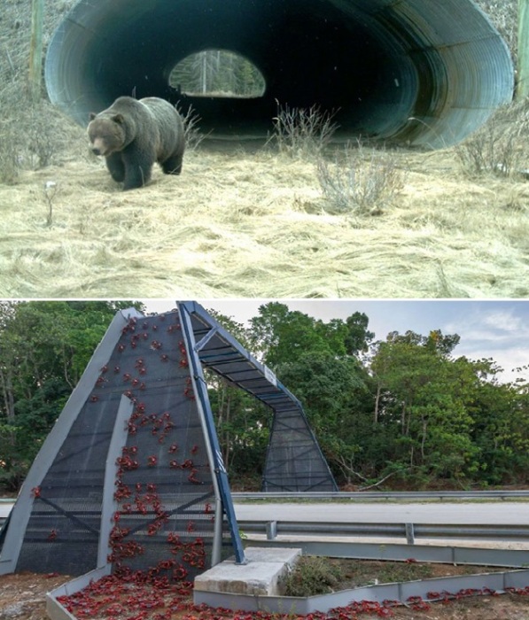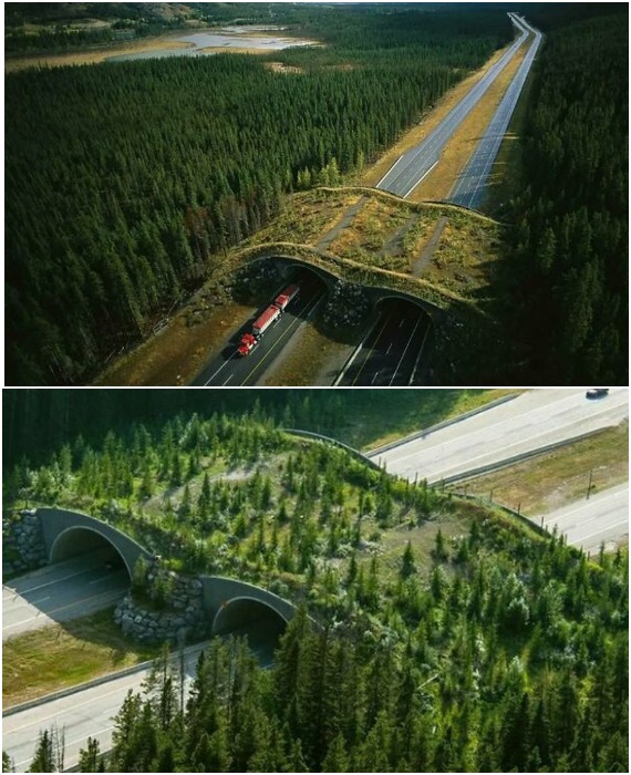 Экодук на автомобильной трассе, проходящей в Национальном парке Банф обеспечил животных естественной тропой (Канада).