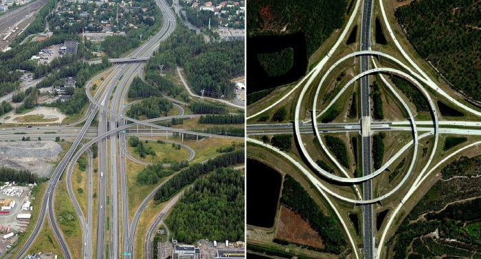 Несмотря на то, что на пути городского шоссе практически отсутствует природное начало в виде буйной растительности, дорожная сеть, как таковая, становится ослепительным и уникальным местом. Ярким примером того, как обычная эстакада является эффектным скульптурным объектом, являются замысловатые развязки, призванные помочь с движением в городе и на объездных трассах, предотвращая многокилометровые заторы на дорогах. Уникальная инфраструктура может показаться запутанной для тех, кто не живет в том или ином городе, но вряд ли она озадачит местных жителей, которым она помогает преодолеть сложную сеть перекрестков и светофоров, обеспечивая бесперебойное движение.