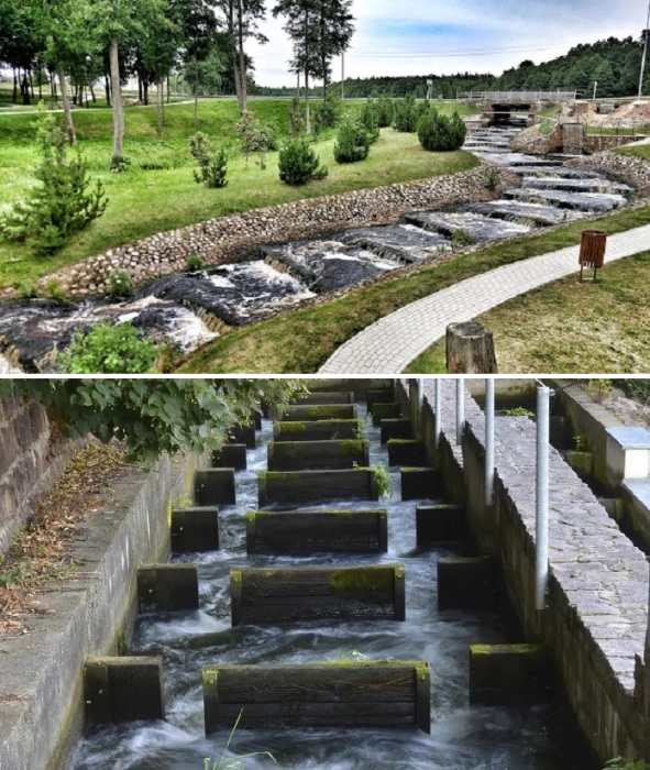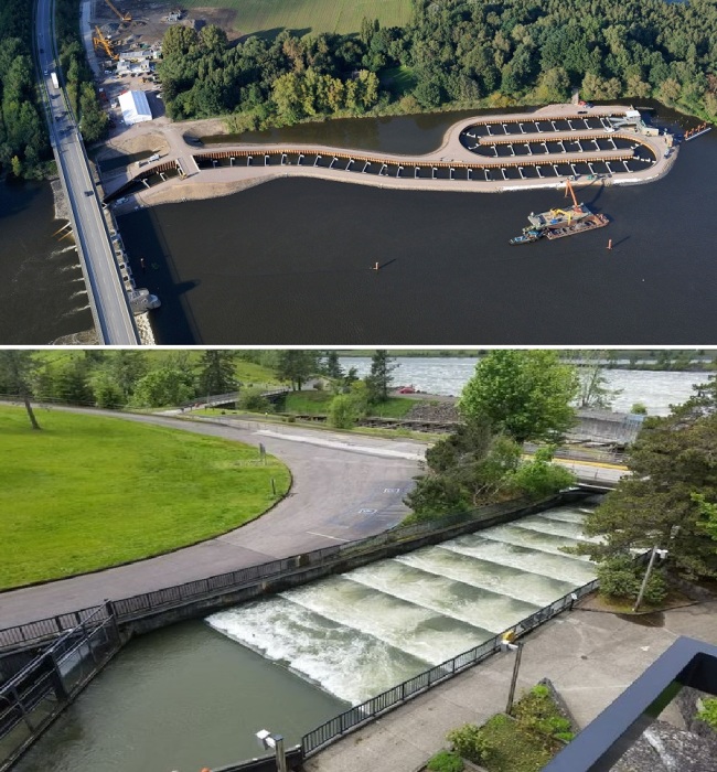 «Рыбные лестницы» предусматривают искусственные и естественные барьеры с интересными плотинами, шлюзами и водопадами.