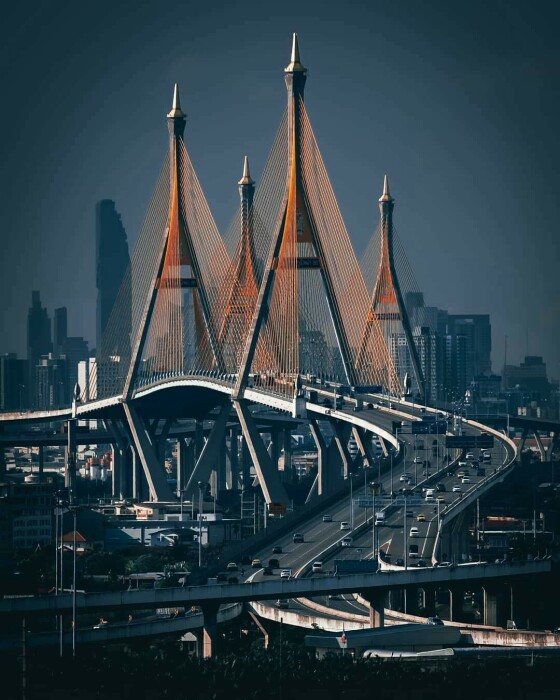 Авторы Novate.ru хотели бы обратить особое внимание на мост, построенный в честь короля Рамы IX (он же Мост Пхумипон), ставший первой и единственной достопримечательностью столицы Таиланда такого рода. Его часто называют Промышленным кольцевым автомобильным мостом, так как он является частью 13-километровой промышленной кольцевой дороги, соединяющей Бангкок и провинцию Самутпракан. Самый большой вантовый мост мира с его уникальнейшими пролетами длиной в сотни метров, удерживаемый двумя гигантскими ромбовидными конструкциями, стал знаковой частью города, являясь одой инженерному и архитектурному подвигу разработчиков, которые смогли построить выдающуюся переправу дважды пересекающую живописную реку Чаупхрая.