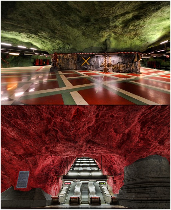 Дизайн станций метро, вдохновленный природным началом подземной каменистой структуры (станции метро Кунстрагорден и Родхусет в Стокгольме, Швеция).