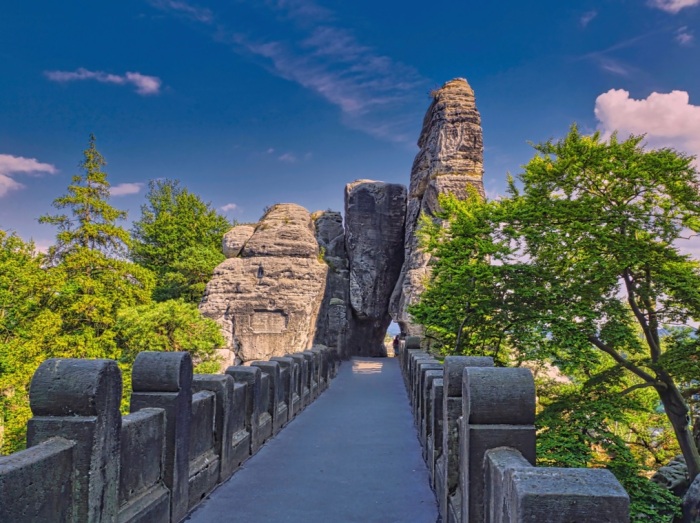 В национальном парке Саксонская Швейцария, где находится красивейшая скальная гряда, возвышающаяся над долиной Эльбы на высоте 305 метров, еще в начале XIX века построили поистине культовый пешеходную переправу, получившую название Мост Бастай (Bastei footbridge). Изначально, он выполнял роль соединяющего звена между двумя сторожевыми башнями, построенными для защиты от непрошенных гостей, стремящихся продвинуться вверх по течению реки Эльбы, и состоял мост лишь из трех арок. Уже к 1850-м годам деревянную конструкцию заменили на каменную и удлинили соединительное полотно так, что мост превратился не в оборонительный объект, а в абсолютную достопримечательность, которую посещают туристы со всего мира последние 150 лет. Привлекают же путешествующих невероятные горные пейзажи, живописная долина, расположенная на глубине практически 200 метров, и впечатляющая конструкция самого моста.