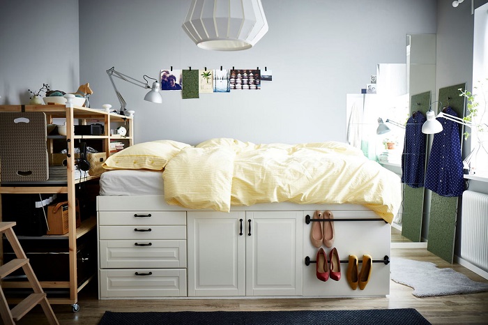 Этот вариант похож на предыдущий, только вместо комода здесь используется стеллаж. Многие считают его более вместительным, но следует быть готовым к тому, что на открытых полках придется постоянно поддерживать порядок. Еще один вариант – установить красивые корзины для вещей, чтобы не провоцировать визуальный шум. Если наличие контейнеров не предусматривается, и вы планируете просто заполнить стеллаж одеждой, тогда решение станет максимально бюджетным – подобную мебель без труда получится сделать самостоятельно или найти недорогой вариант в любом магазине. Идеально вписывать подобные конструкции в ниши, но если в комнате в комнате ее нет, можно закрепить все элементы, которые вы планируете использовать для хранения, на стене.
