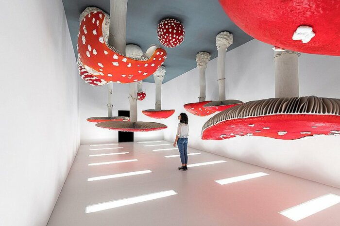 «Грибная комната» от бельгийского художника Карстена Хеллера — это реализация детской сказки, в волшебный мир которой каждый мечтал или все так же мечтает попасть каждый посетитель Центра искусств Fondazione Prada в Милане. По сведениям Novate.ru, Хеллер намеренно выбрал красно-белый мухомор из-за его психоактивных свойств, сильно преувеличивая размер самих грибов, их цветовую гамму и текстуру, чтобы усилить драматическое воздействие на человека. Подвесив их к потолку вверх ногами, автор идеи заставляет посетителей наклоняться и даже уменьшаться в размерах, пробираясь сквозь «заросли» хрупких на первый взгляд шляпок. Эту инсталляцию Хеллер превратил в интерактивный опыт, который задействует все тело и разум, что позволяет создавать впечатление участия в чужой постановке. Он сравнивает преобразующую силу этих грибов не только с процессом просмотра, главным является взаимодействие человека с произведением искусства, нацеленное на пробуждение изобретательности и творческого мышления в процессе самого движения.