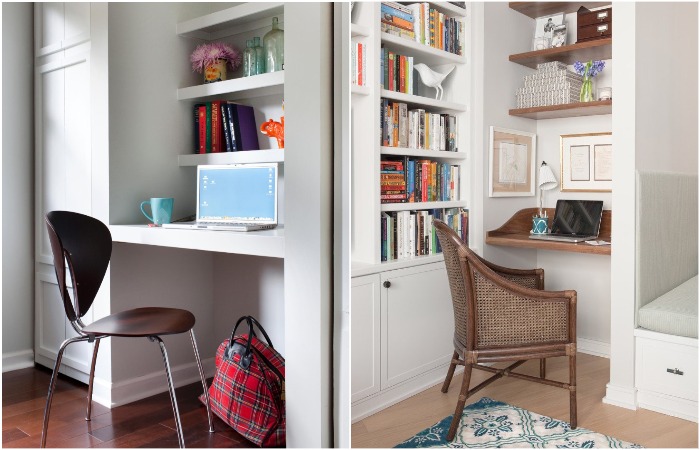 Если в квартире предусмотрено много систем хранения или у вас просто мало вещей, используйте нишу, предназначенную для обустройства шкафа, в качестве мини-кабинета. Мебель должна быть максимально минималистичной – громоздкий стол замените на подвесной, массивное кожаное кресло – на лаконичный стул с комфортным сиденьем и спинкой. Дополните картинку несколькими полками для хранения, и этого хватит для того, чтобы вы продуктивно работали и чувствовали себя здесь максимально удобно.