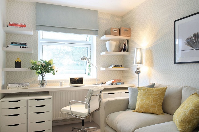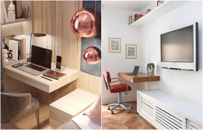 Этот вариант является, пожалуй, самым мобильным, и становится идеальным решением для квартир, в которых есть небольшая ниша. В магазине можно подобрать отдельно подвесной стол и полки, а можно найти цельную конструкцию, которая будет крепиться на стену. И в первом, и во втором случае пространство внизу останется свободным, поэтому ногам ничего не будет мешать. Хорошо, если стол будет оснащен выдвижным ящиком, в который после рабочего дня получится спрятать ноутбук и ежедневник. Книги, канцелярию, документы можно хранить на полках. Там же по возможности разместите уютные мелочи, которые сделают атмосферу кабинета более теплой.