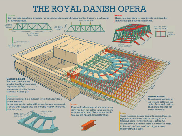 Новое здание оперного театра Копенгагена может похвастаться уникальной конструкцией масштабной крыши, имеющей длину 158 метров при ширине 90 метров. Крыша завораживает сразу по нескольким причинам: ее площадь превышает 14 тыс. кв. метров, консольная часть выступает без дополнительных опор на 41 метр, она очень тонкая и полая. Еще одно интересной особенностью является тот факт, что задняя (восточная) и передняя (западная) части крыши не соединяются между собой, поэтому каждая сторона является независимой кровельной структурой. Несмотря на то, что эти части очень похожи, но самой большой головной болью оказалась передняя ее часть, ведь она выходит далеко за стены здания. Свес крыши колеблется от 21 метра по бокам, и до 41 метра в центре конструкции, что требовало неординарного подхода к проектированию и инженерным расчетам.