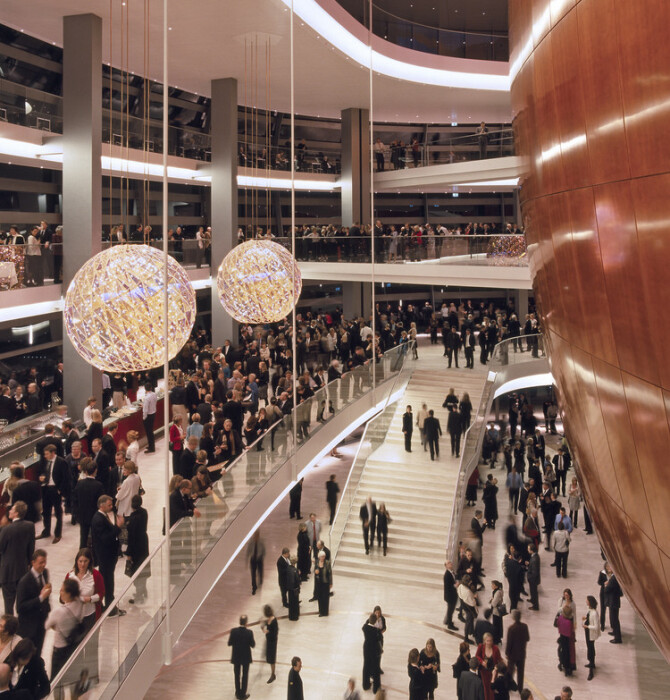 В вечернее время главной изюминкой дизайна интерьера все-таки являются 3 огромные люстры, спроектированные исландским художником Олафуром Элиассоном. Они сделаны из большого количества кусочков разноцветного стекла, которые одновременно отражают и поглощают свет, создавая удивительное мерцающее световое шоу. А вот дневное фойе превращается в обзорную площадку, особенно второй и третий ярусы, проходящие впритык к стеклянному фасаду. Оттуда открывается фанатический вид на гавань и историческую часть Копенгагена, так что гости получают массу удовольствий и от увиденного за окном, и от богатого, но благородного убранства, и от театрального действа происходящего на сцене.