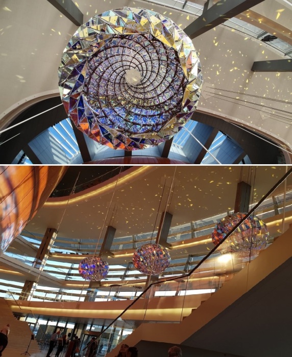 Дизайнерские люстры от исландского художника Олафура Элиассона придают интерьеру особую загадочность и яркость (The Royal Danish Opera, Копенгаген).