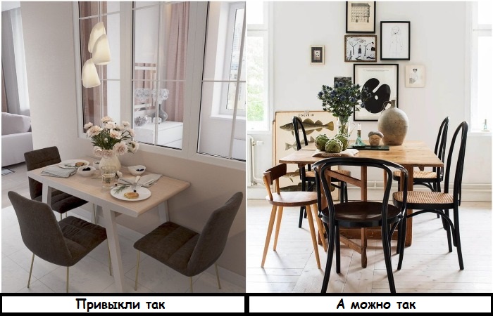 Наверняка вам попадались в интернете фотографии кухонь и столовых, в которых стулья были разными. Сначала картинки вызывали недоумение, потом – снисходительную улыбку (кто покупает в интерьер разные стулья?!), а в конце – заинтересованность, ведь именно благодаря присутствию такой мебели интерьер выглядел необычно и стильно. Конечно, это эксперимент, и далеко не в каждом стиле интерьера стулья разных моделей, размеров и цветов смотрятся уместно и гармонично. Но если вам хочется добавить изюминку в дизайн кухни, то почему бы и нет? А чтобы картинка не получилась хаотичной и безвкусной, придерживайтесь некоторых правил: стулья должны быть равными по высоте (при этом ширина и глубина могут быть разными), пересекаться по цвету или дизайну. Также следует добавить хотя бы одну одинаковую пару.