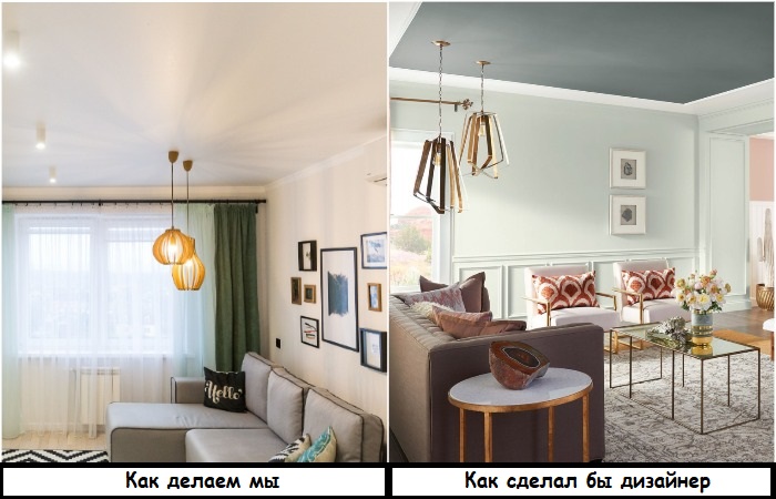 В то время как для стен и пола отделку выбирают очень долго и скрупулезно, потолок обычно оставляют без должного внимания – его просто красят в белый цвет. Отчасти это связано со страхом, что вычурный потолок сделает комнату более тесной, однако это не всегда так. При правильном подходе он способен даже визуально увеличить помещение. Советуем немного поэкспериментировать с дизайном и выбрать акцентное покрытие. Отдавайте предпочтение сложному «припыленному» оттенку, который сможет создать особую атмосферу и ощущение объемного, глубокого пространства. Также можно покрасить потолок в цвет стен, чтобы между ними стерлась граница и перекрытия зрительно стали выше.