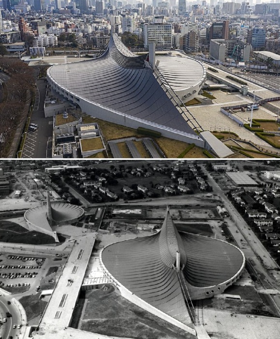 Спроектированная Кензо Танге и построенный менее чем за два года, спортивная арена стала не только местом проведения летних Олимпийских игр 1964, но и показала, что такого масштаба сооружения тоже могут иметь фантастические формы (Токио, Япония).