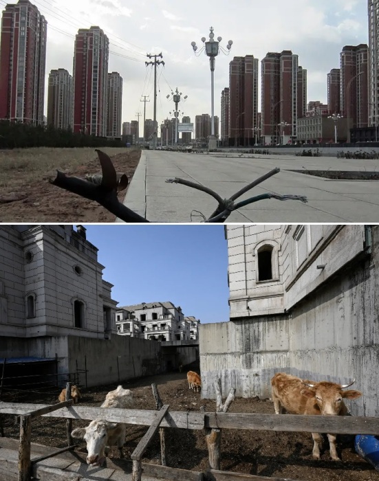 Вместо ультрасовременных городских пространств и роскошных вилл полное запустение, активное заселение животными и растительностью (Китай).