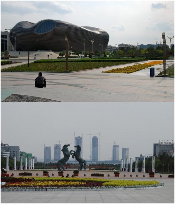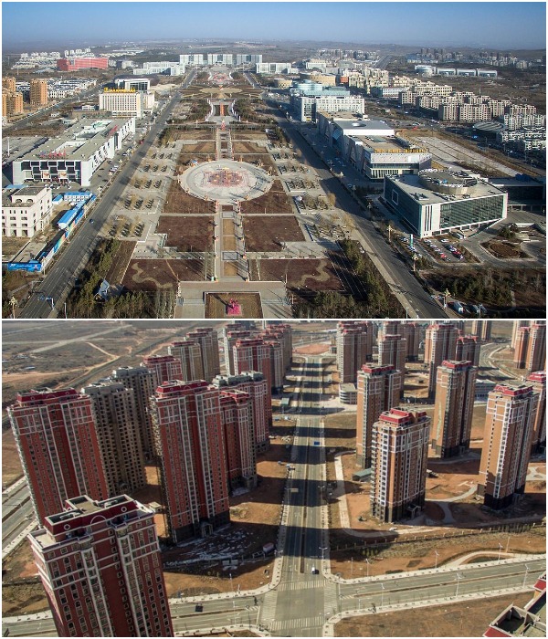 Новый город Кангбаши, рассчитанный на проживание более миллиона человек, до сих пор пустует, хотя небольшая часть квартир заселена (Китай).