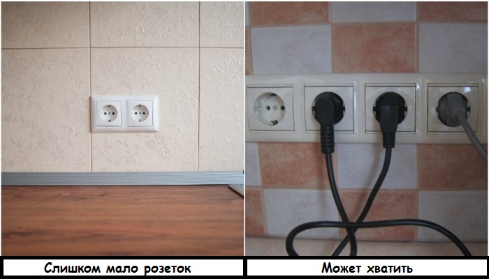 Одно из главных правил любого ремонта – розеток много не бывает. Даже если вы думаете, что двух-трех штук в этой зоне будет вполне достаточно, в процессе полноценного проживания в квартире вы осознаете, что их катастрофически не хватает, а исправить уже ничего нельзя будет (по крайней мере, бесплатно). Учитывайте тот факт, что со временем ваше жилье будет обрастать электроприборами, как дерево мхом, и если сейчас на кухне вы пользуетесь только электрическим чайником и холодильником, то со временем понадобится розетка для блендера, кофеварки, вафельницы и прочих бытовых приборов.