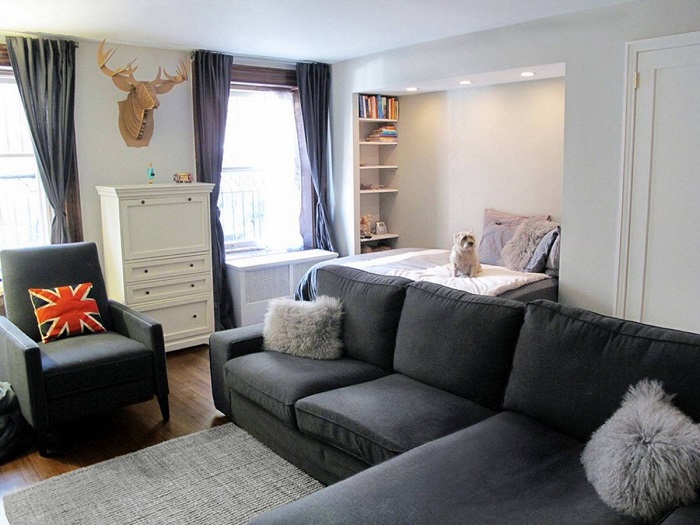 Обратите пристальное внимание на многофункциональную мебель или «трансформеры»: журнальный столик, который превращается в обеденный, пуфики, которые складываются друг в друга, кресло, которое раскладывается в дополнительное спальное место – все это сможет существенно разгрузить пространство, и квартира не будет выглядеть как каморка.