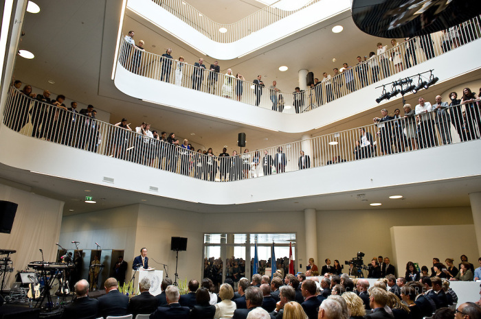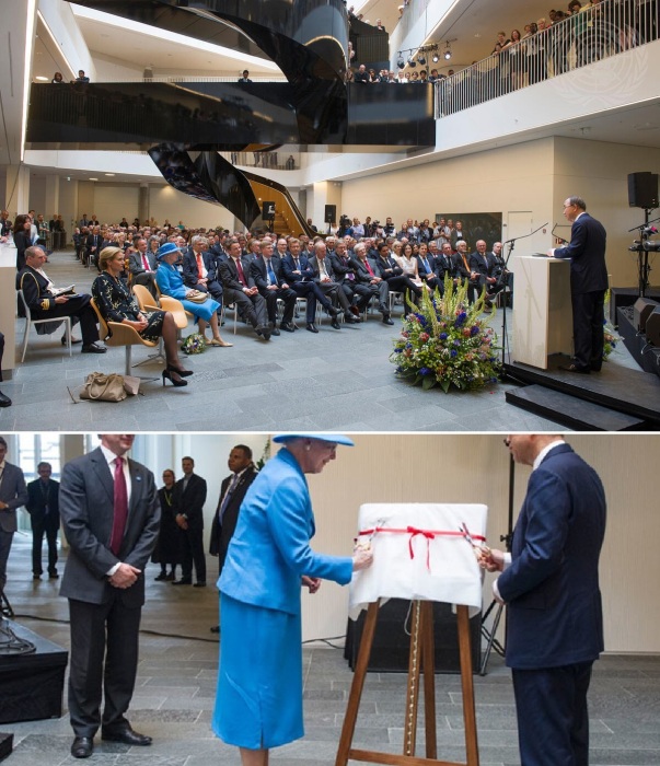 На церемонии открытия присутствовали Генеральный секретарь Пан Ги Мун, королева Дании Маргрете II, сотрудники офиса и общественность (UN City, Копенгаген).