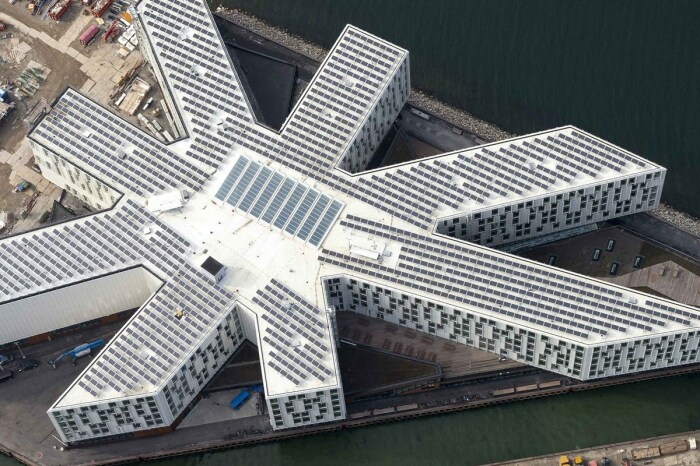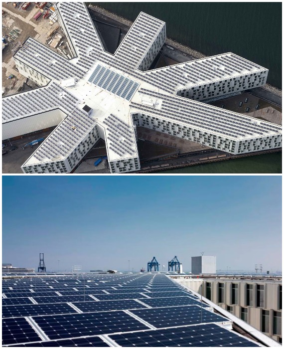 Масштабная крыша Кампуса 1 всплошную покрыта солнечными панелями, чтобы обеспечивать нужды здания в электроэнергии (UN City, Копенгаген).