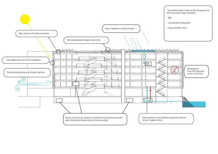 Точки внедрения систем и оборудования, позволившие сделать здание максимально энергоэффективным (план-чертеж Кампуса 1). | Фото: eco-business.com.