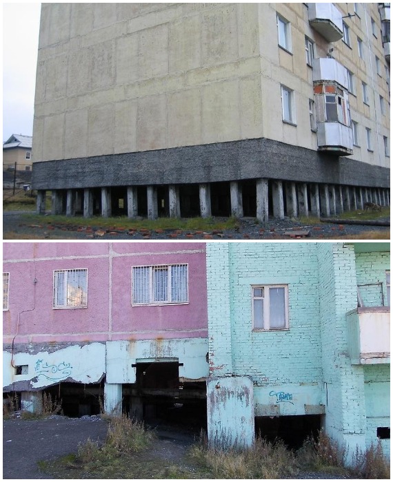 Многоэтажные дома Норильска строили на опорах-сваях, которые вмораживали в вечную мерзлоту. | Фото: stroiteh-msk.ru.