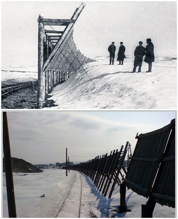 Щиты Потапова устанавливались вдоль железной дороги, чтобы предотвратить снежные заносы путей.