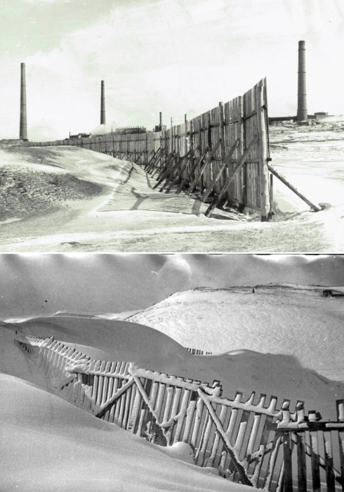 Стоит отметить, что параллельно со строительством жилых домов и общественных зданий делались попытки обезопасить дороги от снежных завалов, которые ведут к промышленным предприятиям, а также обеспечить бесперебойную работу железной дороги до Дудинки (100 км), проходящей по арктической пустыне среди вечной мерзлоты. Это была единственная нить, связывающая «материк» с Норильском (из города отравляли руду, а из Дудинки поступали продукты питания, медикаменты, строительные материалы и т. д.). Разработкой защитных ограждений занимался также заключенный – инженер-железнодорожник Михаил Потапов, которого приговорили к принудительному труду в конце 1930-х за «связь» с опальным маршалом Тухачевским. Талантливый маршал первым понял положительные перспективы машины для выжигания травы на путях. Изобретение Потапова использовалось советской военной промышленностью, ну а сам автор пригодился для других дел, только в качестве бесправного заключенного.
