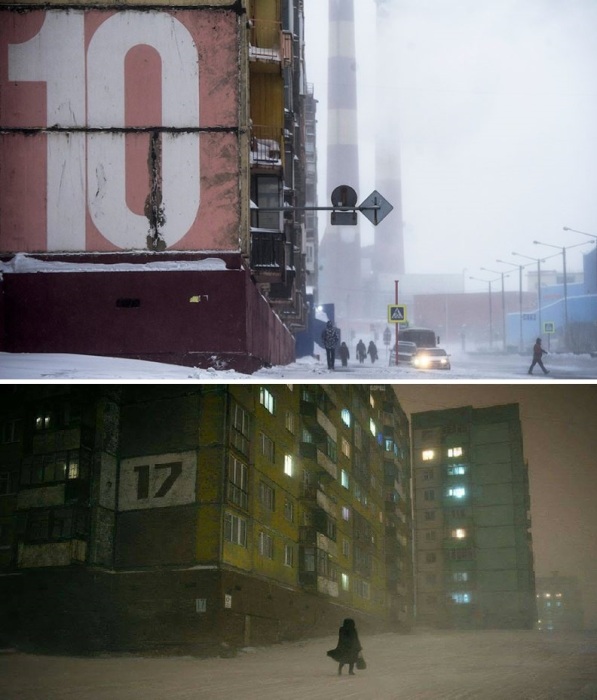 Учитывая сложнейшие климатические условия, организация городской инфраструктуры требовала особого расчета и грамотного планирования. Из-за постоянных ветров, которые сбивают с ног даже самых тренированных людей, снежных бурь и полярной ночи, улицы Норильска и оформление зданий имеют свои особенности. Так, например, начиная с 1980-х панельные дома начали окрашивать в яркие цвета, размещая номера гигантских размеров. Это сделано для того, чтобы легче было ориентироваться во время полярной ночи или снежной бури, ведь такие детали легко заметить издалека даже при пониженной видимости. Зная эти тонкости, во время пурги могут передвигаться даже гости Норильска без риска потеряться в сугробах.