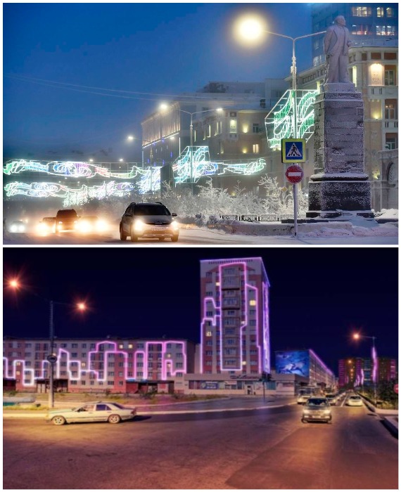Также стоит отметить, что в этом городе освещение улиц не игнорируется, а как раз наоборот, дома, расположенные вдоль тротуаров и дорог все до одного увешаны гирляндами. И делается это не только во время новогодних празднеств. Тотальная иллюминация стала главной отличительной чертой Норильска. И если в короткий летний период огни включают только в вечернее и ночное время, то как минимум 8 месяцев в году они горят круглосуточно, являясь главным ориентиром для жителей и гостей самого северного и самого холодного города мира, численность которого неизменно растет даже несмотря на более чем недружелюбные природные условия.