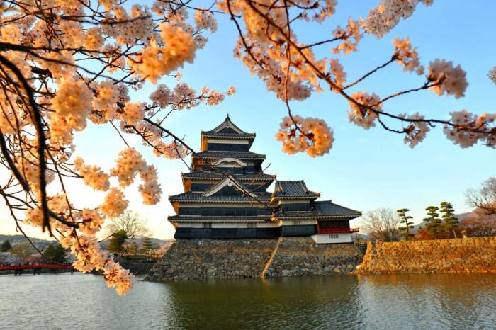 Один из знаковых оригинальных замков Японии находится в префектуре Нагано, в районе Японских Альп, находящихся прямо в центре острова Хонсю. Речь идет о замке Мацумото, который относится к типу оборонительных сооружений под названием «хирадзиро». Это означает, что замок построен на равнине, а не на холмах или горах, как это было принято в Японии и в других станах мира в более ранний период истории. Фортификационное сооружение, чаще называемое «Вороньим замком» из-за его завораживающе черного глянцевого фасада, источает очарование и величие, которые чувствуются издалека. Бытует мнение, что этот цвет владелец замка Тоётоми Хидэёси выбрал не просто так, а потому, что его извечный соперник Токугава Иэясу предпочитал белый цвет. Такое противостояние явило Японии уникальный объект с насыщенной историей, которое особо очаровательно и привлекательно в момент цветения сакуры.